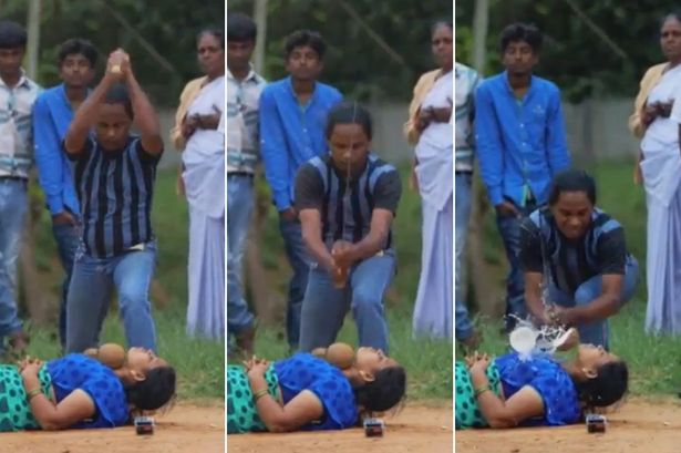 PERTUNJUKAN jalanan yang dilakukan pasangan suami isteri di Chirala Mandal, India mampu menghentikan jantung penonton apabila seorang lelaki menetak leher isterinya.